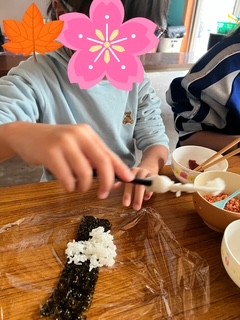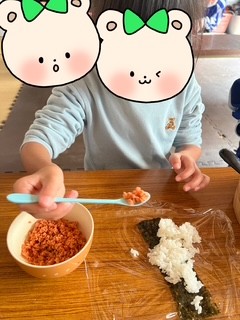 皆色々な大きさにして握っていました!!(^▽^)/鮭や梅干しをミックスしたり自分のオリジナルを作りました!!